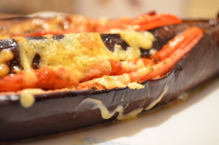 Баклажани, на відміну від решти продуктів, ще повинні попередньо пропектися, тому викладаємо їх на змащене олією деко та відправляємо в розігріту духовку на 10 хв. Поки наш основний продукт приймає теплові ванни, ми маємо час приготувати начинку!