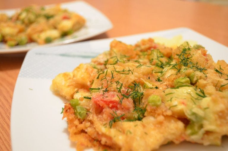 Змащуємо форму для запікання або деко оливковою олією, посипаємо половиною панірувальних сухарів, викладаємо основну суміш, притрушуємо рештою сухариків і відправляємо в духовку на 20 хв.