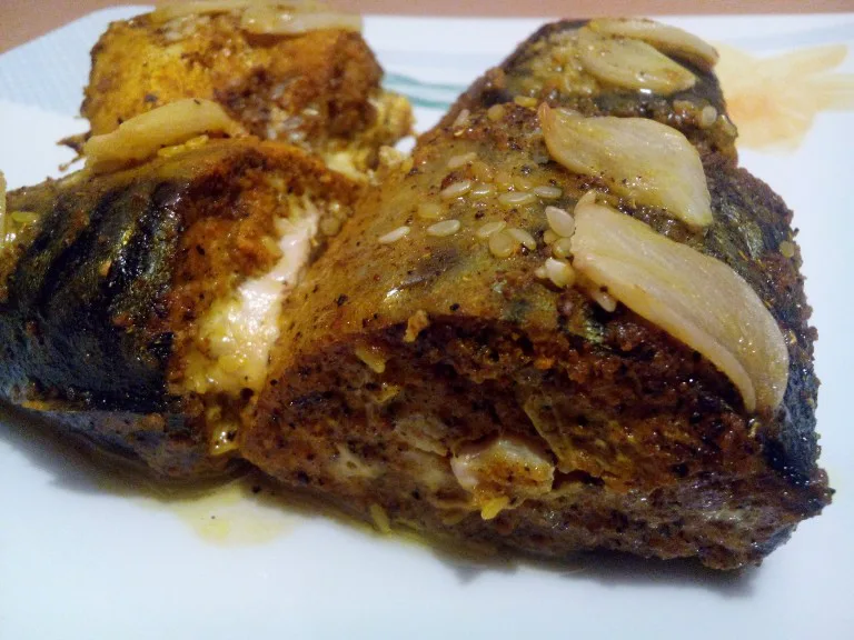Рецепт запеченої скумбрії починається з розморожування риби... ну якщо вона ще заморожена) Ретельно чистимо та вимиваємо рибину. Обов'язково треба видалити чорну плівку всередині на ребрах (бо вона дуже гірка). Відрізаємо голову та хвіст і розрізаємо скумбрію на 4 рівні частини. Ці шматочки треба протерти паперовим полотенцем, щоб позбутися зайвої вологи і спеції рівномірно покрили рибку.