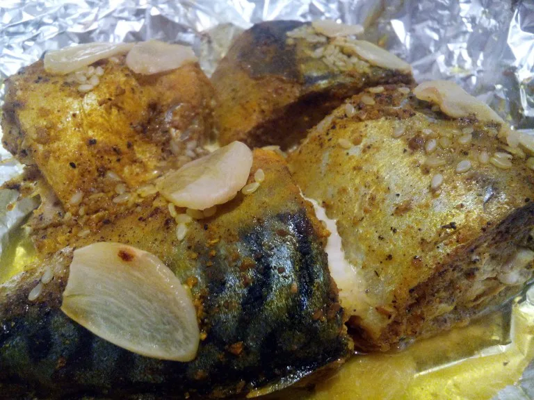 За цей час можна нарізати часник тонкими пластинками. Посипаємо рибку кунжутом і викладаємо зверху порізаний часник, скроплюємо оливковою олією та лимонним соком, акуратно загортаємо у фольгу. <strong>Скумбрія запечена в духовці</strong> при 200°С протягом 30 хв буде готовою для подачі.