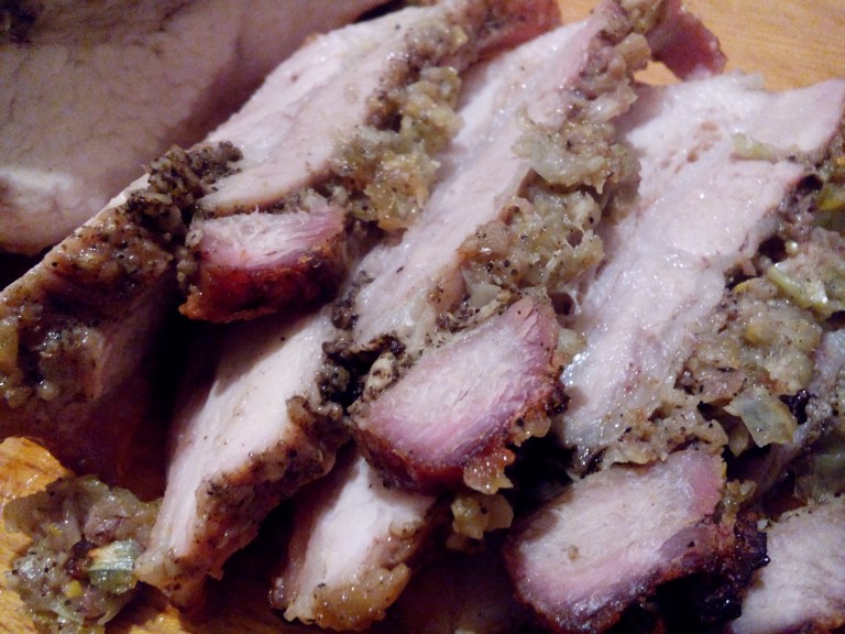 Повертаємось до нашого сальця. Треба зробити йому масаж, попередньо посипавши спеціями: коріандр, сіль та перець. Натираємо добре з усіх сторін, за виключенням тієї де шкіра. І на останок натираємо отриманою сумішшю з цибулі та часнику (і тут теж важливо не плакати). Якщо шматок товстий, треба ще й нашпигувати його цим всім ділом і дати підчеревині "промаринуватись" хоча б з годинку.