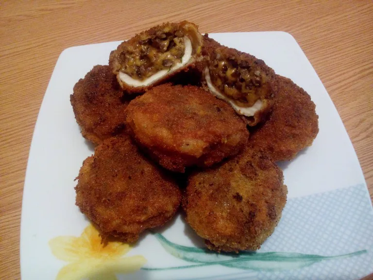 Печериці в кисло-гострому маринаді, солодко-гостра начинка та хрустка скоринка з панірувальних сухарів... Здивувати гостей незвичним приготуванням легко)