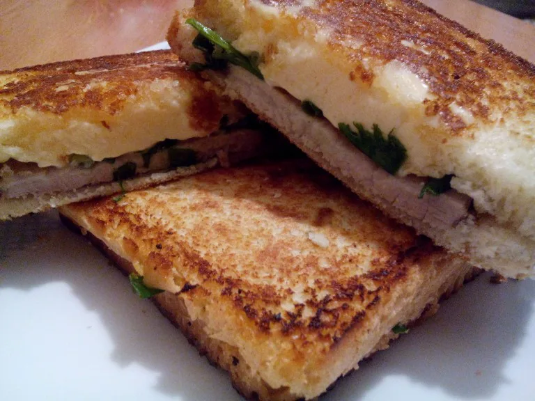 Кладемо сендвіч на добре розігріту велику сковороду з невеликою кількістю олії. Спочатку сендвіч кладеться так, щоб сир був знизу, смажиться до скоринки і перевертається. Притискається меншою сковорідкою або каструлею (прослідкуйте, щоб дно було добре вимите) і знову до скоринки.